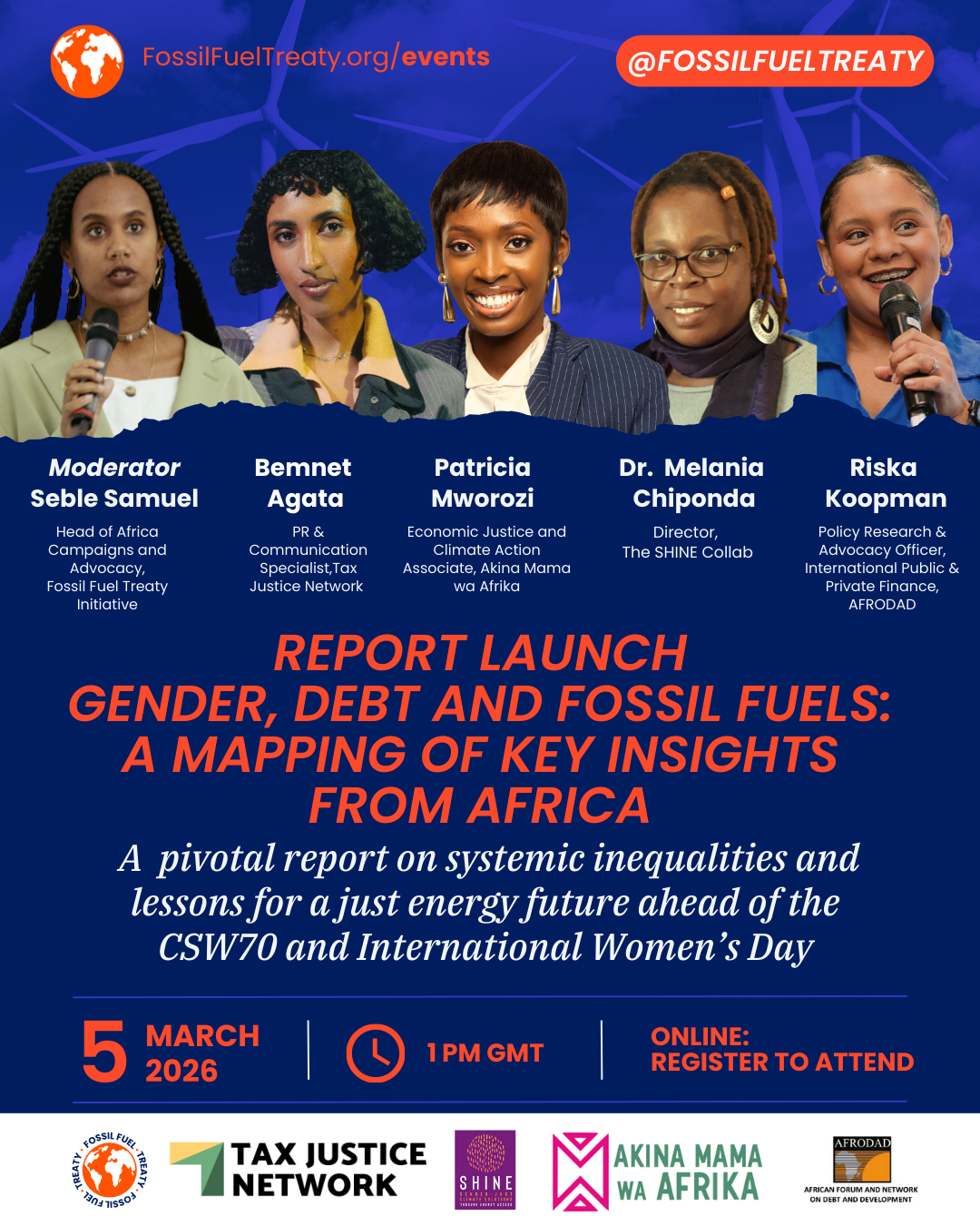 In the leadup to International Women’s Day, the Fossil Fuel Treaty Initiative and partners invite you to the launch of a new report, “Gender, Debt and Fossil Fuels: A Mapping of Key Insights from Africa.”